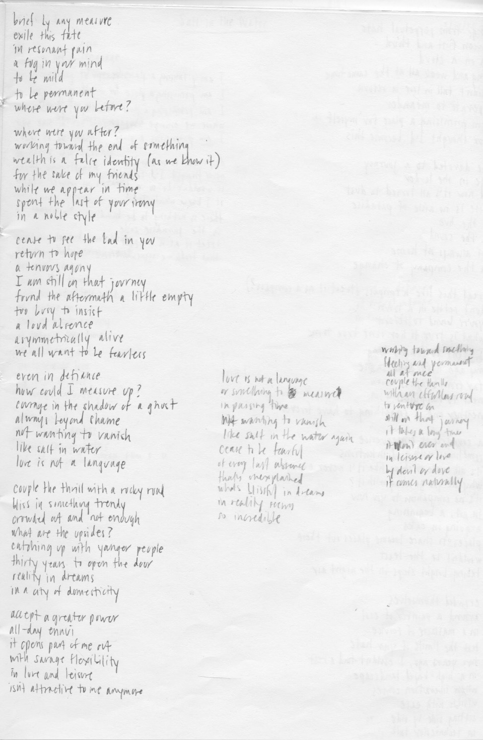 This page of free writing gave me a lot to work with from the start. Near the middle, you can see a few lines that make up the first half of the first verse. I’m guessing that I started to write off the top of my own head at this point, because “not wanting to vanish / like salt in the water” sounds like something I would voluntarily write. These days, I’m really attracted to metaphors that feel grounded in reality, but aren’t cliche and overused. And those two lines are right up my alley. Anyone who makes pasta has witnessed salt and water blending together, and I thought there was some beauty and anguish in that as an image in the mind of someone who doesn’t want to disappear.
